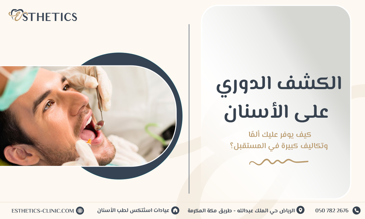 يساعد الكشف الدوري على اكتشاف مشاكل الأسنان مبكراً قبل تطورها والوقاية من التسوس والحفاظ على صحة الفم والتقليل من الحاجة إلى علاجات مؤلمة أو مكلفة.